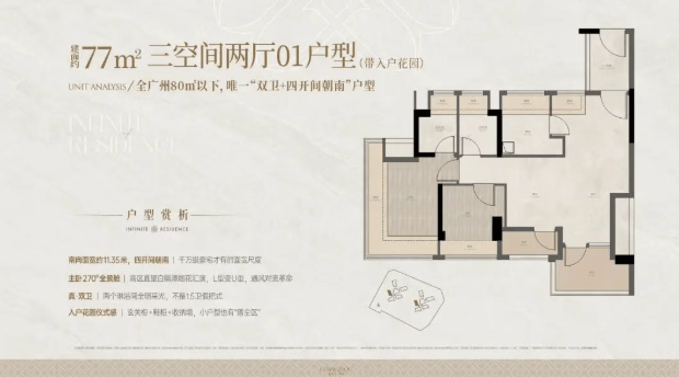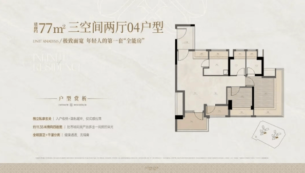 建面约 77㎡三房两卫:经典刚需户型,4 条梯腿,总计 100 套,是市场上稀缺的小户型三房两卫产品。户型方正,全明通透,三开间朝南,采光通风极佳;动静分区明确,卧室与客厅互不干扰;双卫设计,解决家庭早高峰洗漱难题,提升居住舒适度;空间利用率高,无浪费面积,总价门槛低,是刚需人群入主白鹅潭的最佳选择。