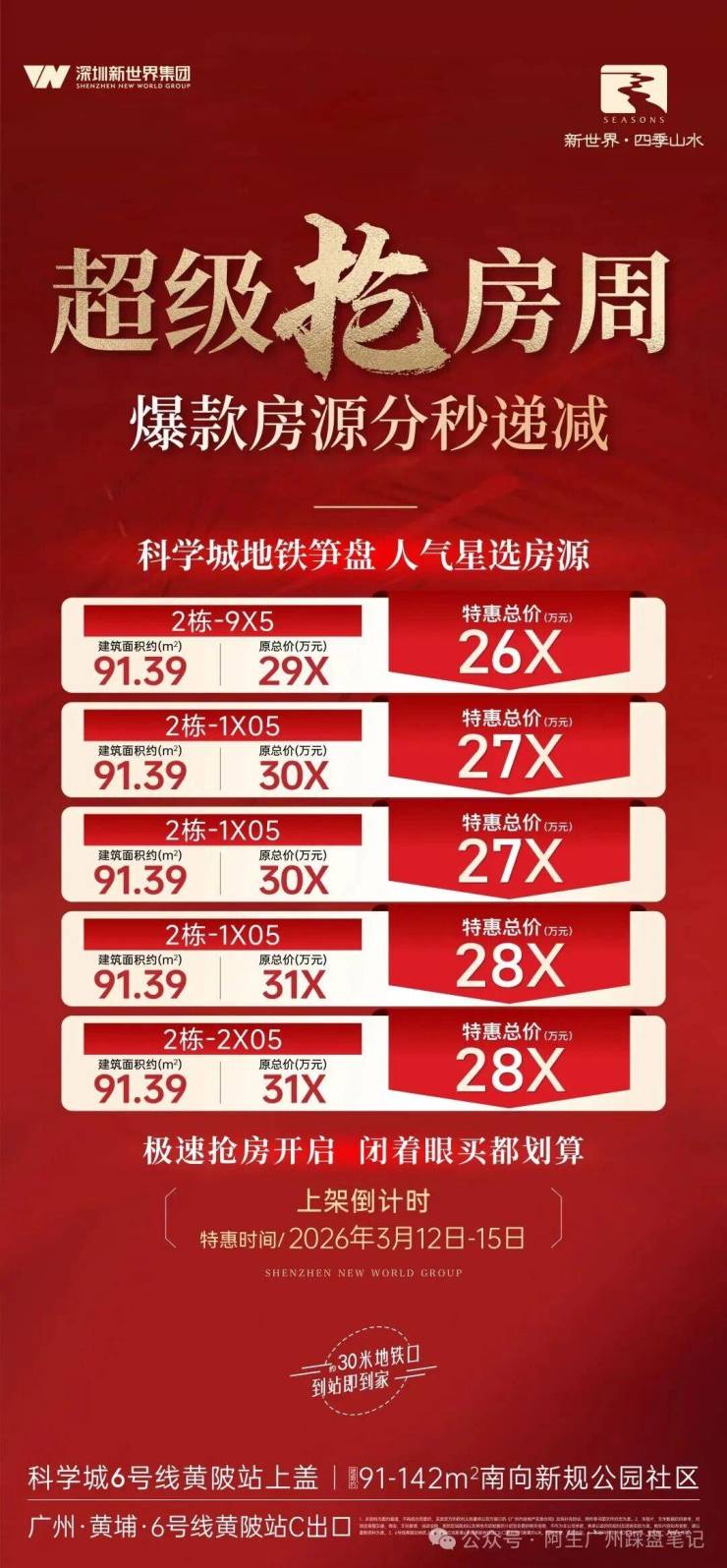新世界四季山水定位**TOD全能住区**,雄踞科学城黄陂核心板块,是区域内真正意义上的地铁上盖住宅项目,以高效通勤、高使用率户型、全维配套、优越生态四大核心优势,成为科学城刚改市场标杆作品。项目占位天河与科学城交汇枢纽,承接双板块产业外溢与人口红利,区位价值持续提升,居住与投资属性兼备。
