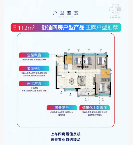 建面约142㎡四房户型,横厅设计、空间阔绰,四开间朝南,环幕采光面带来极致视野。公共空间开阔大气,适合家庭聚会与社交待客;双卫格局、干湿分离,高频收纳系统满足大家庭居住需求,是改善置业的理想选择。