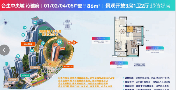 F5栋为央景楼栋,超宽楼间距,南向无遮挡,直面中央园林,86㎡三房低总价高性价比。