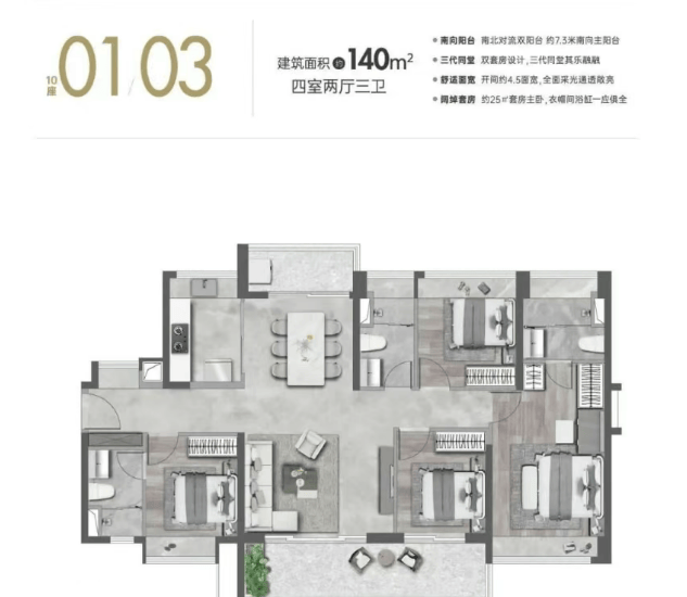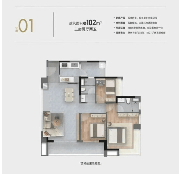 五矿万境水岸户型跨度广泛,从72平米至263平米不等,满足不同家庭结构的需求。近期全新加推的15栋,面积在102-120平米之间,得房率最高可达100%,堪称全大良得房率最高的三房户型之一。所有户型均采用南北双阳台对流设计,搭配U型厨房与阔绰主卧套房,空间利用率高达90%。