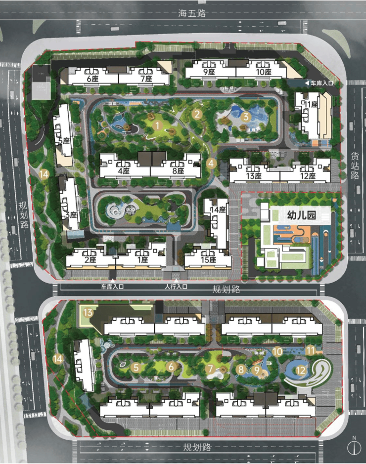 其中北区由15栋住宅+一所幼儿园组成,南区由9栋住宅组成,全是17-18层的板楼设计,这个中层设计,佛山非常罕见。