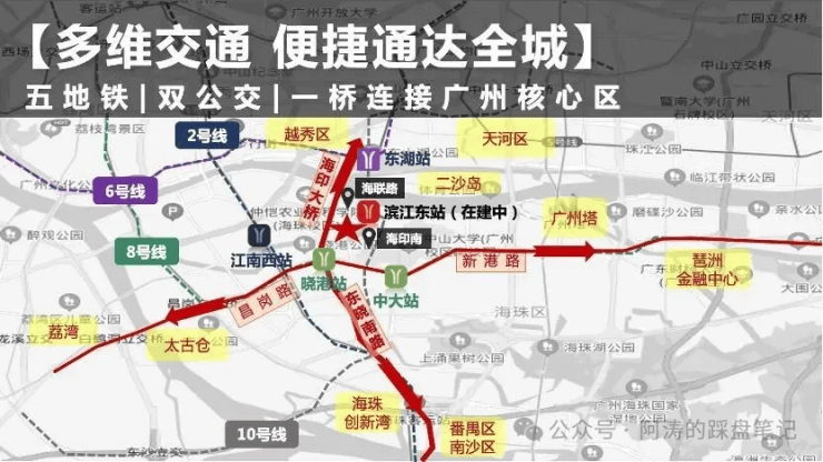 公共交通方面,项目1公里范围内享有双地铁加持,出行便捷度拉满。距离地铁8号线晓港站步行可达,该线路贯穿广州主城,可快速换乘其他线路,通达广州火车站、琶洲、万胜围等重要区域;地铁10号线滨江东路站(在建中)与项目距离不足800米,预计开通后将进一步优化区域交通格局,为业主出行提供更多选择。除了地铁,项目家楼下即为海印桥南公交站,汇聚24条公交线路,穿梭于广州主城各区,覆盖日常出行的各类场景,轻松抵达北京路、江南西、客村等商圈。