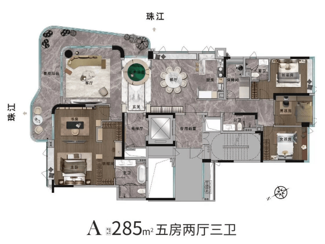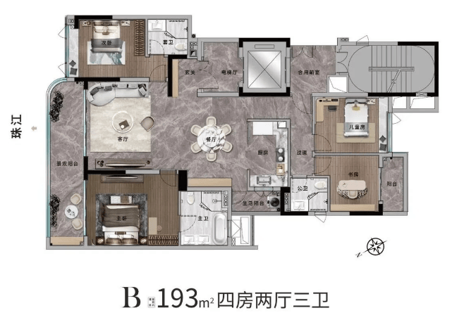 项目占地约1.4万平方米,总建面仅约2.7万平方米,容积率控制在≤2.68,绿地率高达40%,全盘仅规划一栋18层住宅,总计68户,堪称“微盘中的孤品”。产品仅两种面积段:193㎡与285㎡瞰江大平层,户均面积超200㎡,真正实现“一户一藏品”的私密格局。物业方面,引入曾服务亚洲十大豪宅的兰雅物业,并特邀深耕广州27年的本土老牌天力物业担任专属顾问,形成双物业服务体系。这种配置不仅保障日常服务品质,更在圈层运营、私宴定制、安全礼宾等方面提供高阶体验,契合塔尖人群对“隐形服务力”的极致追求。
