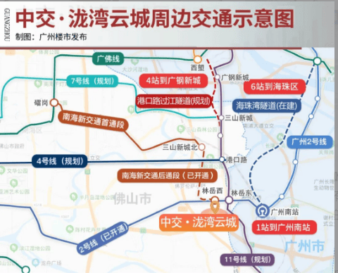中交泷湾云城是真正意义上的地铁上盖TOD项目,坐拥**三轨双站**超级交通网络,下楼即地铁,一站直达广州南站,广佛通勤效率冠绝板块。轨道交通方面,约30米风雨连廊直通地铁站,佛山2号线已开通,1站即达广州南站,站内无缝换乘,半小时通达广州中心;南海新交通已通车,25分钟连通桂城千灯湖,林岳西站可同台换乘2号线;佛山11号线预计年内动工,林岳东站换乘后4站达广钢、6站达海珠,加速广佛双城融合。道路交通方面,三龙湾大道、三山大道、科创大道等立体路网环绕,30分钟无缝连通广佛CBD,5分钟直上广珠西线,一桥直达广州南站。高效交通体系让项目实现“工作在广州、居住在佛山”的理想模式,每日可节省约2小时通勤时间,让业主有更多时光陪伴家人。