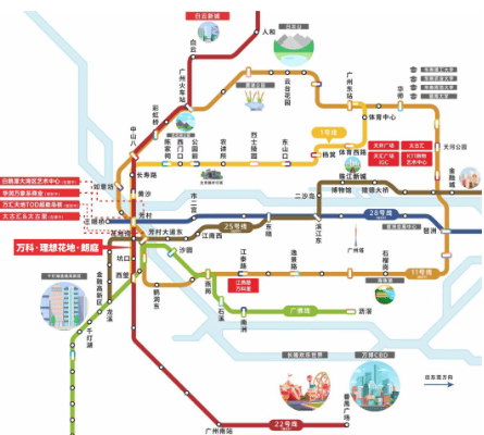 地理位置:万汇天地·朗庭位于花地湾商务组团,距离白鹅潭、聚龙湾双太古非常近。项目距离1号线地铁花地湾站仅800米,步行约11分钟即可到达。此外,未来还有地铁25号线(规划中)、22号线(在建)及28号线(规划中),进一步增强了交通便利性。自驾方面,周边有浣花路、花地大道等主要干道,方便快捷通达广州各区。