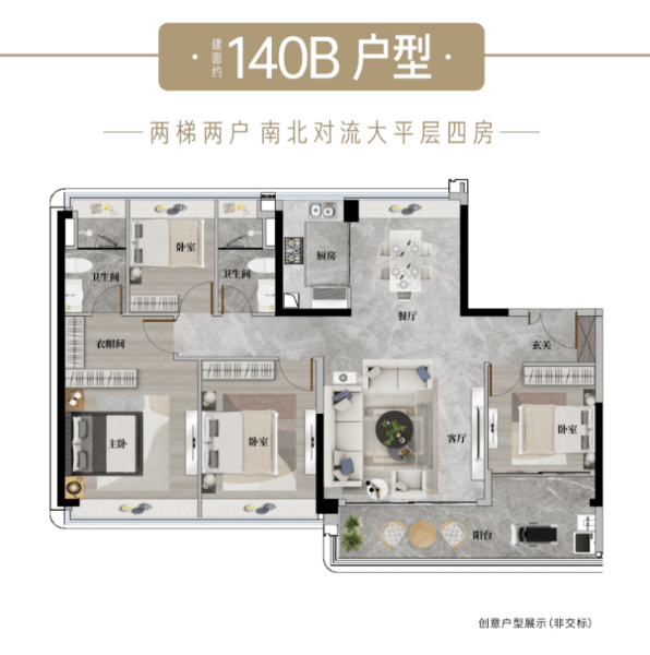 建面约140㎡高定四房分为两个版本:A户型位于高层,拥有开阔的城市景观视野,适合喜欢登高望远的年轻家庭;B户型则为17层小高层,北瞰中央园林,南望校园美景,特别适合重视教育环境的家长。两款户型均采用板式布局,南北对流,四开间朝南,全屋精装交付,配备酒店式星级卫浴和厨房系统,性价比极高。