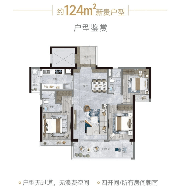 对于首次置业的年轻家庭来说,广开控股城投云锦的建面约124㎡三房两厅两卫户型绝对是不可错过的明星产品。这款户型分布在1、2栋,采用了纯南向的板式设计,南北通透,采光极佳。