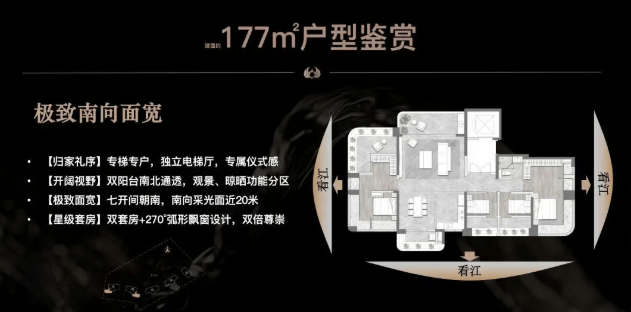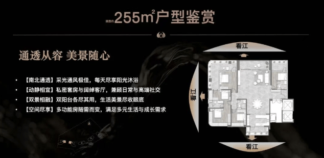 特别值得一提的是东区的高端产品定位,包括A1-A6#(无A4)五栋住宅,提供260㎡和290㎡的大平层户型,保证每户都能享有最佳观江视野。