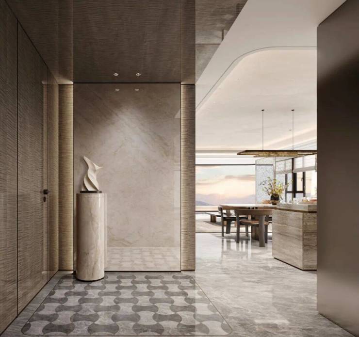 入户细节:金融级智能锁、通高门设计、银杏叶拼花岩板玄关,归家即享仪式感;