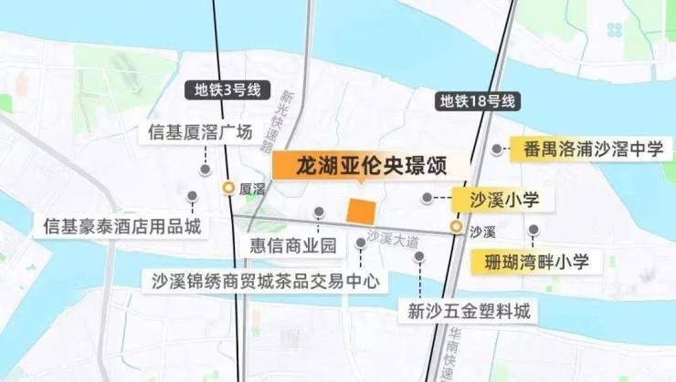 龙湖亚伦央璟颂交通便利,离珠江新城特别近,并拥有3号线和18号线两条地铁线路。项目距离沙溪地铁站约600到700米,乘坐18号线可一站抵达万博,两站到达琶洲,三站即可到达珠江新城。此外,华快和新光两大高速公路也为自驾出行提供了极大便利,从项目到珠江新城IGC仅需约20分钟车程。