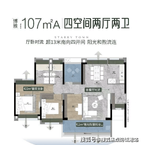 建面约 107㎡的 4 空间 2 厅 2 卫户型,配置南向观景玄关,仪式感入户。4.5 开间朝南,客厅主卧双南北对流,畅享双面宽观景阳台,飘窗拓宽功能空间。此外,该户型还采用了交互式方厅设计,可开可合,满足不同家庭的生活需求。