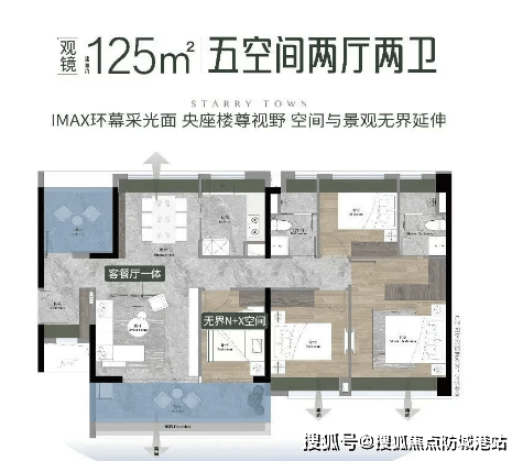 建面约 125㎡的 5 空间 2 厅 2 卫户型,4.5 开间朝南,客餐厅南北对流,舒适阳光宅。餐客一体化,百变大方厅,满足生活多样使用。双面宽观景阳台,南北满飘窗,实用率超高。