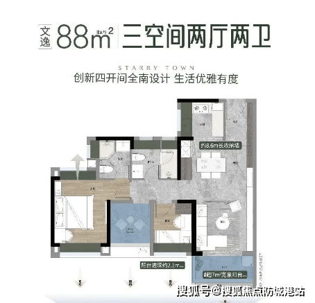 以建面约 88㎡的 3 空间 2 厅 2 卫户型为例,该户型为罕见的四面宽小户型,朝南居家生活,三卧室朝南,超 11 米景观线,与阳光无限亲近。同时,该户型还拥有精细化收纳设计,约 10 米收纳墙,可藏纳全家人的爱好。