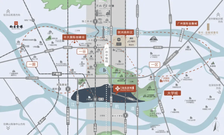 **当下即享的成熟路网:** 项目紧邻城市主干道南洲路,可快速接驳**华南快速干线**、环城高速等城市动脉。自驾前往珠江新城、琶洲商务区等核心板块,车程约在20-30分钟,通勤效率极高。同时,项目周边公交线路密集,可便捷换乘至各大区域。