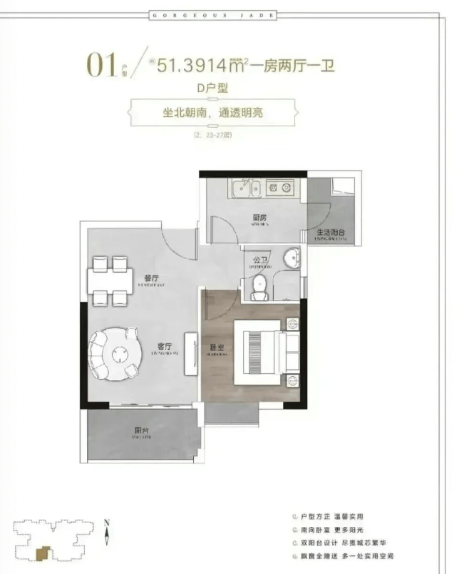 ✅ 51㎡一房:方正布局+客厅小阳台,总价194万起,适合单身或过渡;