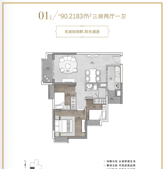 ✅ 90㎡三房:U型厨房+干湿分离公卫,次卧可放儿童床,三口之家首选;