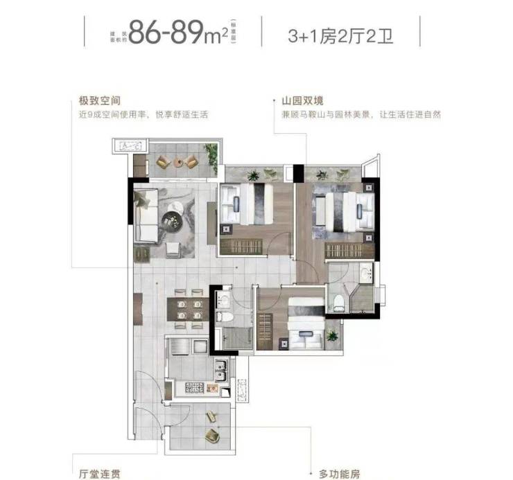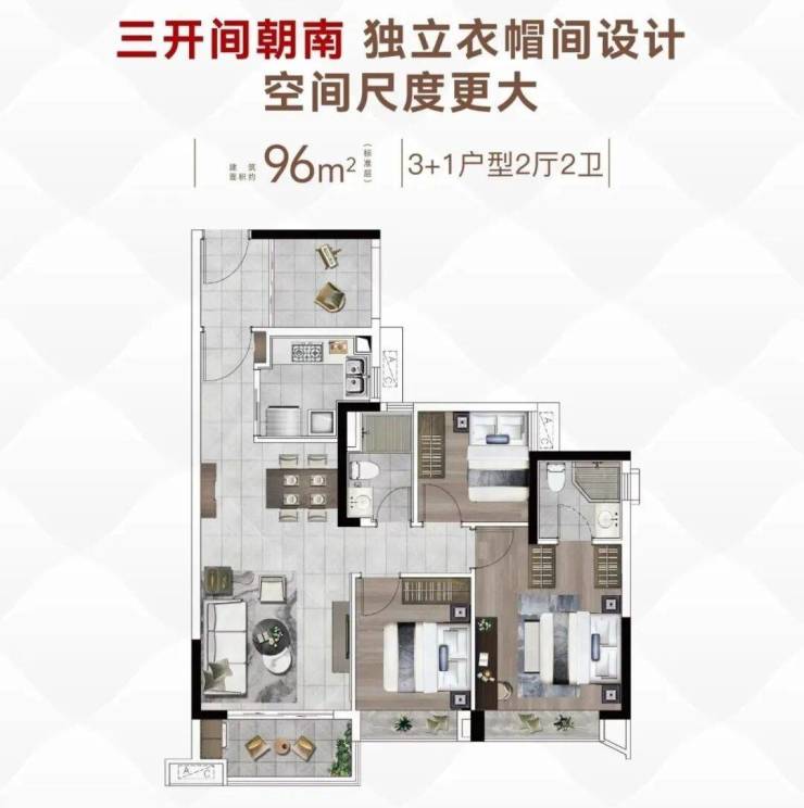 96㎡3+1房:三开间正南向,灵动空间可改造为书房或儿童房,总价约576万起;