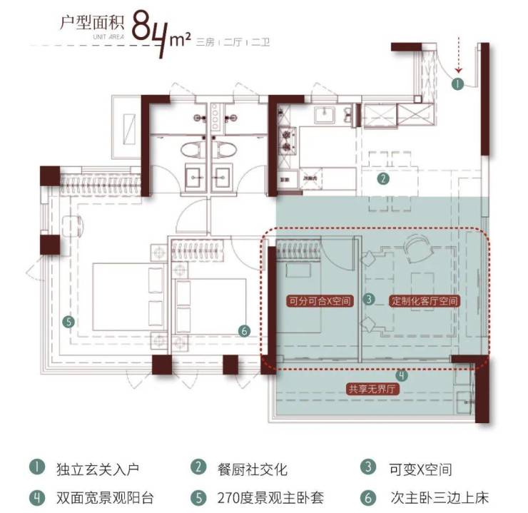 让我们把目光聚焦在具体户型上,首先是备受瞩目的约84平方米三房户型。这个户型的设计堪称教科书级别的“小空间大智慧”。四开间朝南的布局,保证了整个户型的采光和通风效果达到了极致。无论是主卧、次卧,还是客厅和餐厅,都能享受到充足的阳光。开放式LDK(Living-Dining-Kitchen,客餐厨一体化)设计,配合U型厨房,不仅美观大气,更加实用高效。U型厨房提供了充足的备餐空间和收纳空间,让烹饪过程变得轻松愉悦。客厅连接着X空间,这是一个多功能区域,可以根据家庭需求灵活变换用途,既可以作为儿童的游戏区,也可以作为老人的健身角,甚至是临时的书房。5.4米的开间,结合双面宽阳台,打造出了一个开阔通透的公共活动区域。在这个空间里,一家人可以围坐在一起享受晚餐,也可以邀请朋友来聚会聊天,欢声笑语充满了整个屋子。双面宽阳台的设计,更是将室外的自然景观引入室内,让居住者仿佛置身于大自然之中。这种设计,不仅提升了居住的舒适度,更增强了家庭成员之间的情感交流。对于84平方米的房子来说,能拥有如此宽敞的客厅和阳台,实属难得。如果您对84平方米户型的具体尺寸、家具摆放方案或是X空间的多种可能性感兴趣,不妨拨打售楼处电话:400-062-8010,我们的设计师将为您提供专业的户型解读和软装建议。