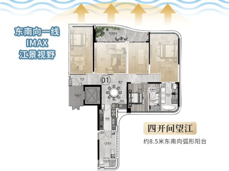 项目推出的户型设计以舒适性与采光为核心理念,户型涵盖139㎡三房、191㎡四房、233~335㎡四房及255㎡顶级奢宅。每个户型均采用板式结构,户型一字排开,大面宽设计让阳光与江景无阻入室。270°圆弧玻璃阳台和南北双阳台设计,实现空气对流与景观一体化,营造健康、舒适的居住体验。