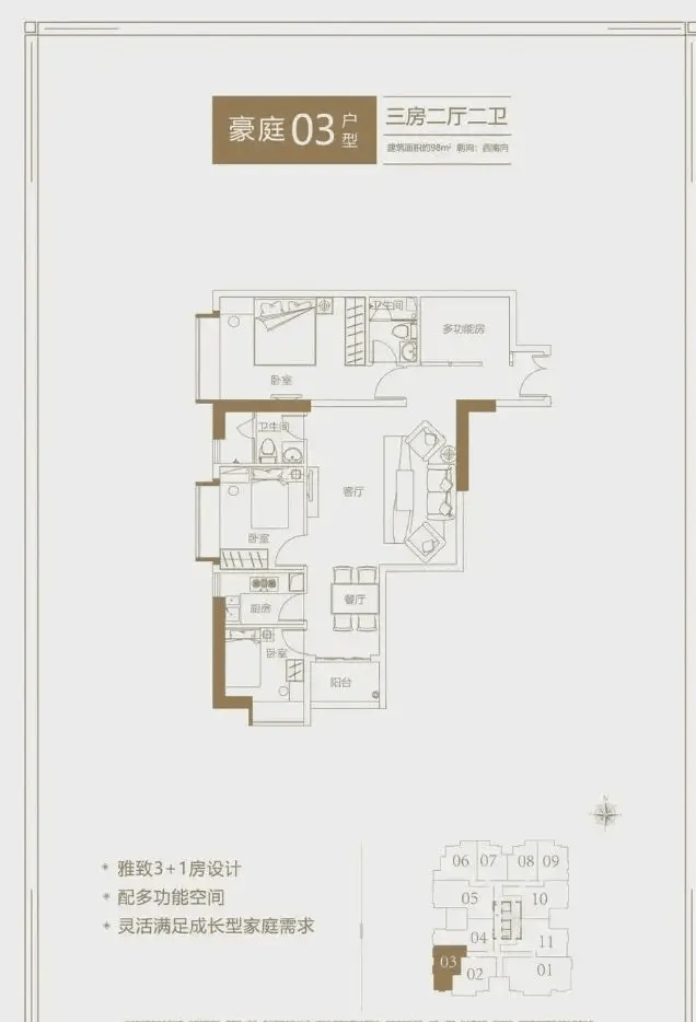 淘金半山户型:得房率120%,实际使用面积120㎡,四房两厅+独立储物间。场景化描述:多出的20㎡可以打造为书房(满足居家办公需求)、健身区(配置跑步机、瑜伽垫)、保姆间(适合三代同堂家庭),或预留为孩子未来的独立卧室。