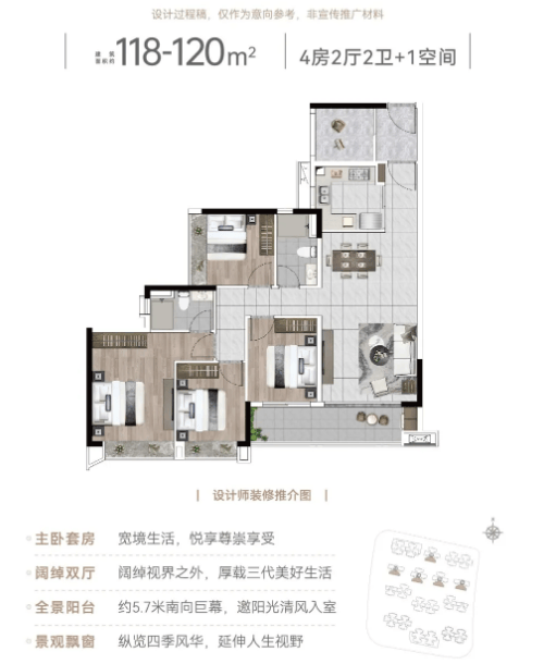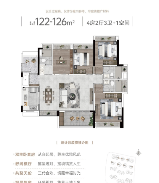 改善型户型面积段为,规划为三室两厅两卫、四室两厅两卫等布局,空间开阔舒适,私密性更强。部分改善户型配备观景阳台,直面马鞍山山景和社区中央园林,推窗即可欣赏绝美风景,提升居住体验。主卧采用套间设计,配备独立卫生间和衣帽间,满足业主的高品质居住需求。此外,部分户型还采用动静分区设计,将休息区与活动区有效分离,避免了日常活动对休息的干扰,保障了家庭成员的居住私密性。