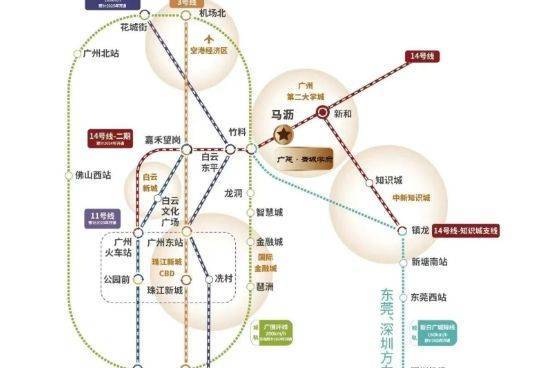 项目交通优势显著,距离地铁 14 号线马沥站 A 出口仅约 100 米,步行仅需 2 - 3 分钟。14 号线二期预计 2024 年全线通车,可 0 换乘直达广州火车站。通过接驳地铁 2/3/18 号线(北延段预计 2025 年开通),可快速抵达嘉禾望岗、公园前、珠江新城、广州东站等地。在新和站可换乘 14 号线知识城支线,一站即达知识城。于竹料站可换乘新白广城际(预计 2023 年开通)与广佛环线(东段预计 2024 年开通),快速通达天河智慧城、金融城、琶洲及湾区各地。18 号线和广佛环线速度高达 160km/h、200km/h,远超普通地铁。此外,京港澳高速、花莞高速等 3 横 4 纵城市主干道环绕,可快速抵达白云机场、珠江新城等地。