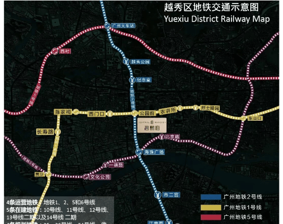 项目距离地铁1号线与2号线交汇站——公园前站仅约400米,步行5分钟即达,可快速换乘覆盖天河、海珠、荔湾、白云等全城核心区域。周边路网发达,紧邻中山路、解放北路、东风路及内环路,自驾10分钟内通达珠江新城、北京路、东山口等重点片区。作为广州轨道交通密度最高的区域之一,公园前板块拥有全市最密集的地铁网络(未来可达13条线路),君熙府坐享“双线交汇+主干道环绕”的立体交通优势,真正实现高效都市生活。