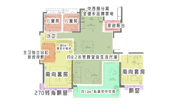 项目主打建面约143-237㎡的大平层户型,其中尤以237㎡的4+1户型最为引人注目。该户型采用了先进的LDKG一体化设计理念,将客厅、餐厅、厨房及阳台空间融为一体,形成了一个超300㎡的开放空间,极大地提升了居住舒适度。此外,主卫配备美妆冰箱等细节处理,更是体现了对品质生活的极致追求。