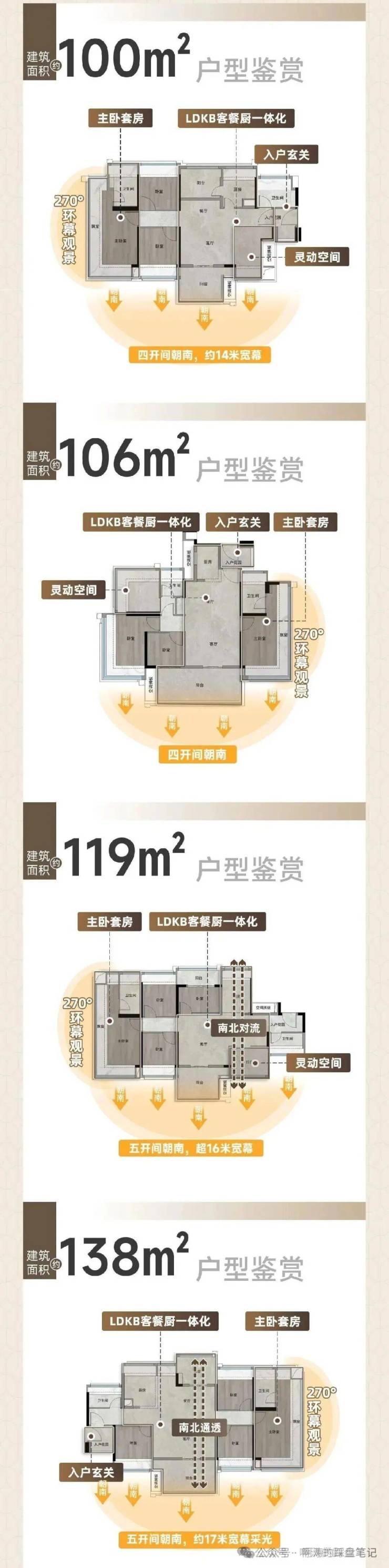 户型设计:全能四房,关照全生命周期。项目主打建面约100-140平方米的三至四房户型,均为纯粹居住设计。户型设计上体现了现代住宅的前瞻性思考: