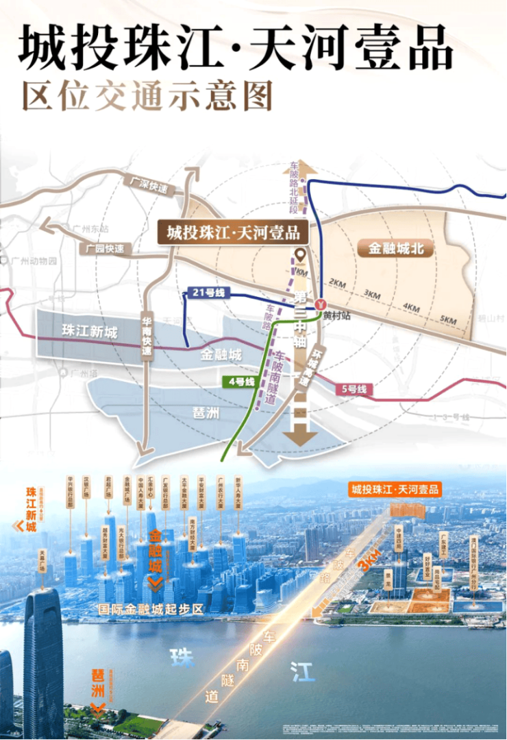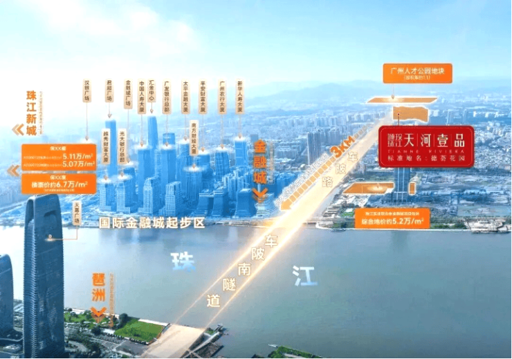 城市主干道方面,项目临近广园快速、科韵路、车陂南路等城市核心主干道,自驾出行可快速接驳全城,轻松抵达珠江新城、金融城、琶洲、白云新城等核心区域。过江隧道方面,已开通的车陂南隧道,直接连通天河与琶洲,大大缩短了两大核心板块的通行时间,自驾往返琶洲电商区、珠江新城 CBD,仅需十余分钟,对于在琶洲、珠江新城工作的购房者而言,通勤极为便捷。