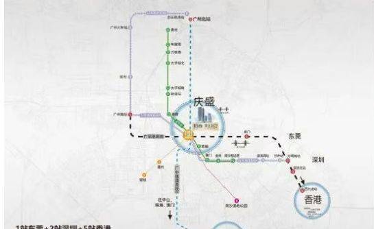 多维轨道交通:距离约 1.5 公里可达庆盛站,该站实现高铁站与地铁站交汇,拥有 4 条地铁、2 条高铁,形成 6 轨道交通、3 高快速路的超强交通网络。其中,地铁 4 号线已开通,5 站可达大学城,9 站抵达琶洲;地铁 22 号线首段已开通,北可至白云机场、南达深圳,一站番禺广场,换乘 18 号线 30 分钟可直达珠江新城;地铁 31 号线(规划中)将串联南沙各大中心板块;地铁 33 号线(规划中)可通达佛山、顺德。广深港高铁 1 站直达东莞虎门,2 站直达深圳北站,5 站直达香港西九龙;广中珠澳高铁(规划中)在庆盛设站,未来可通达中山、珠海、深圳、澳门,实现粤港澳大湾区无缝衔接。
