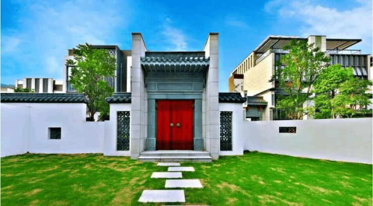由三大国际设计大师联袂操刀,传承岭南建筑精髓,融合现代居住理念,打造新中式岭南院墅:采用天然花岗岩立面、飞檐翘角、青砖灰瓦、中式院门,四重禅意园林、五进归家礼序,复刻岭南大宅风骨。每席赠送价值百万岭南专属院门,雕花工艺、纯实木打造,彰显家族门第威仪,兼具文化底蕴与居住质感。