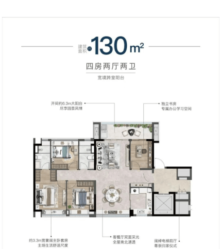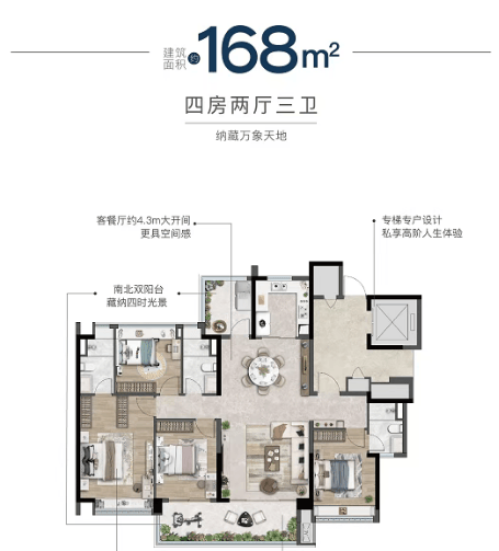 130㎡四房为热门改善户型,私享约 6㎡电梯前厅,客餐厅双面采光,形成约 45㎡的开阔社交空间;6.3 米阔景阳台连通客厅与次卧,远眺梅花岭景观,U 型厨房操作台面长度达 3.5 米,预留双开门冰箱位置,主卧套间面积超 22㎡,配备步入式衣帽间,居住舒适度显著提升。168㎡四房为终极改善户型,两梯两户设计保障私密性,4.2 米大开间客厅搭配 7 米阔绰阳台,俯览 880 公顷天鹿湖森林公园景观;南北双阳台实现空气对流,双主套设计满足三代同堂需求,每一户自带 8㎡高拓空间,实际使用面积媲美 180㎡+ 户型。