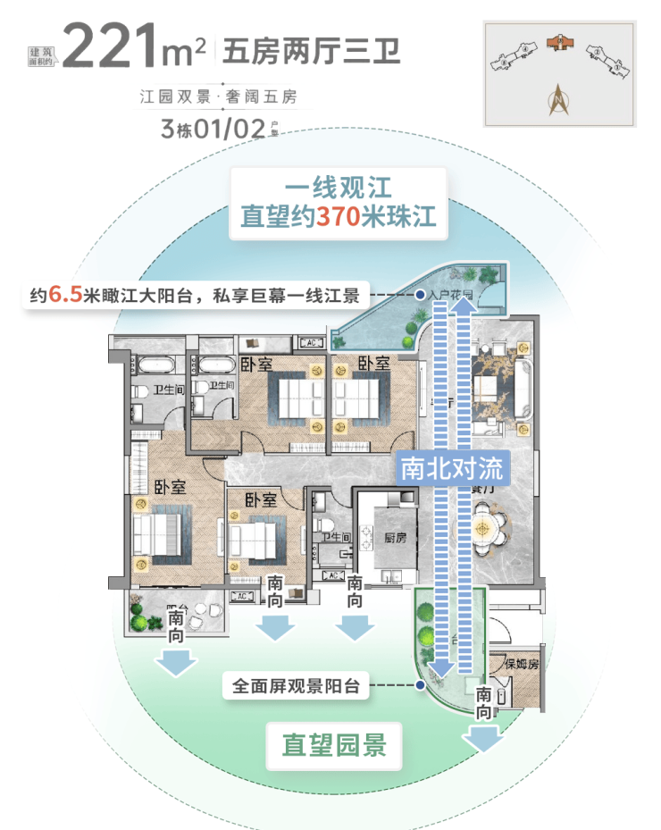 221平方米5房大平层:双主套设计,配有三阳台,其中一个约6.5米瞰江大阳台,享受奢华居住体验。