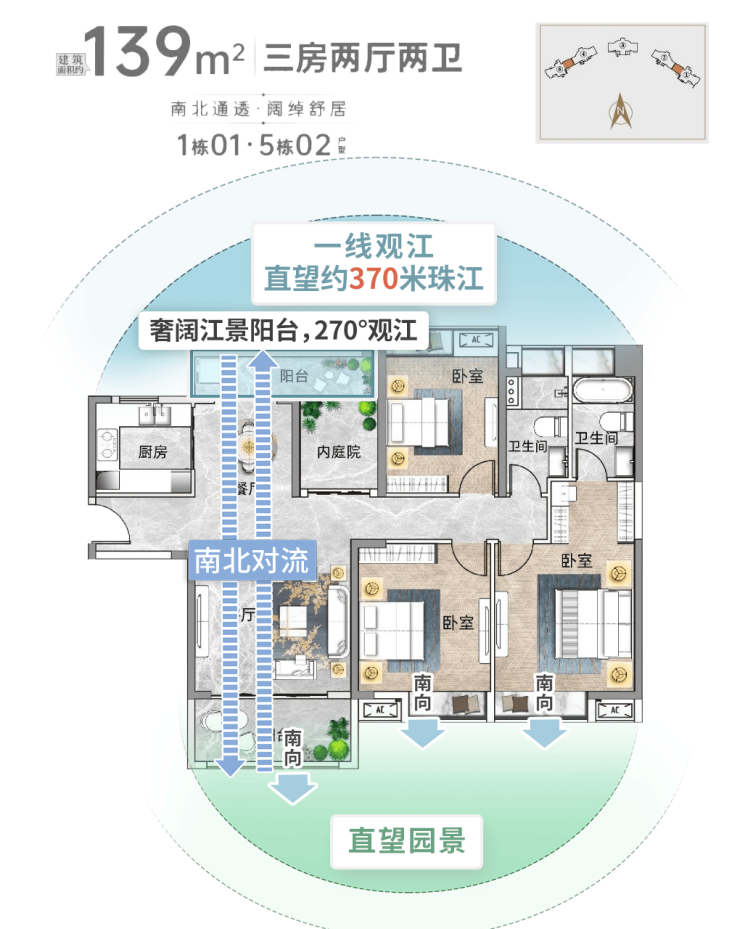 130平方米3+1房:南北双阳台设计,通风对流良好,三开间直望一线江景。