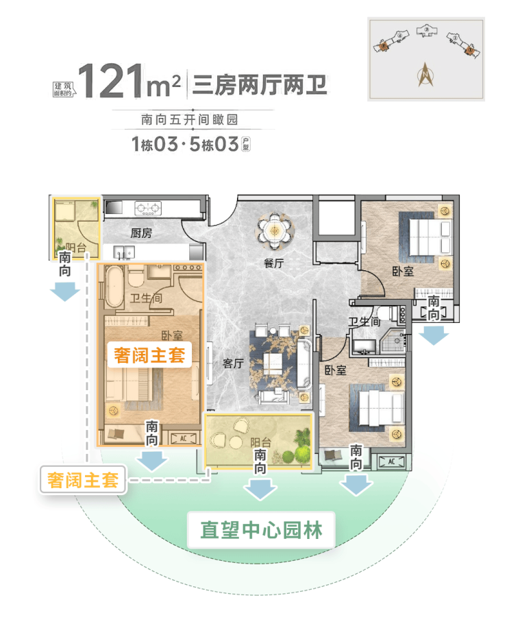 121平方米三房:五开间朝南,主卧配备南向大飘窗和独立卫浴,确保私密性。