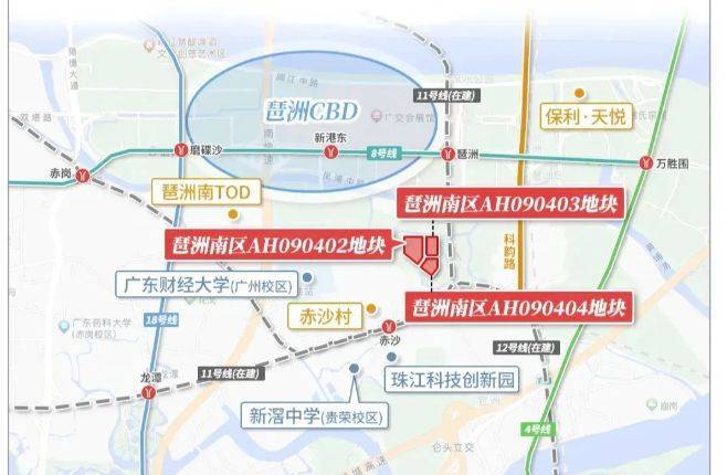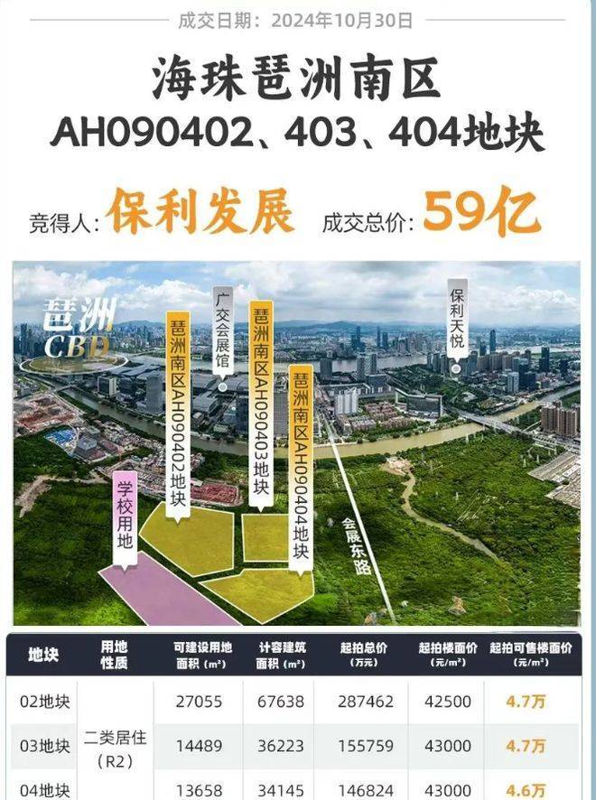 保利天奕的诞生,始于2024年10月30日的一场重磅土拍,当天,保利发展力压群雄,以59亿+的总价,成功竞得琶洲南三兄弟——AH090402号、03号、04号三块核心地块,这三块地总占地面积约6.66公顷,总建面达12.8万方,折合楼面价4.25万-4.3万/平(未扣除配建)。这样的拿地规模和投入,在近年来的广州土拍市场上并不多见,即便当时地块还处于无路无桥的生地状态,也丝毫没有影响保利布局这片热土的决心,这份底气,既源于保利的央企实力,更源于对琶洲南区价值的深刻洞察。