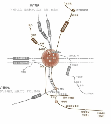 广州白云站 TOD 粤胜广场拥有超级交通网络,集高铁、城轨、地铁多维一体。广州地铁 12 号线计划于 2025 年 6 月开通初期运营,其西北 - 东南走向串联白云新城、二沙岛、大学城等核心区域,并途经白云站 TOD,开通后将实现与市中心、科创高地的快速直达,进一步扩大客流辐射范围。广南联络线(广州站至广州南站)已获省政府批复,线路全长 16.077 公里,设计时速 200 公里 / 小时,连通广州白云站、广州站等枢纽,实现穗港中心城区 1 小时直达,并串联广深港高铁、广珠城际等干线,推动大湾区 “高铁进城” 战略落地。此外,白云站已接入地铁 8 号线,未来还将新增 5 条地铁线路,并与芳白城际(连接白云机场)形成空铁联运。立体化的交通体系,使项目成为 “流量枢纽”,辐射湾区乃至全国的高频商务与旅游人群,无论是商务出行还是日常通勤,都极为便捷。