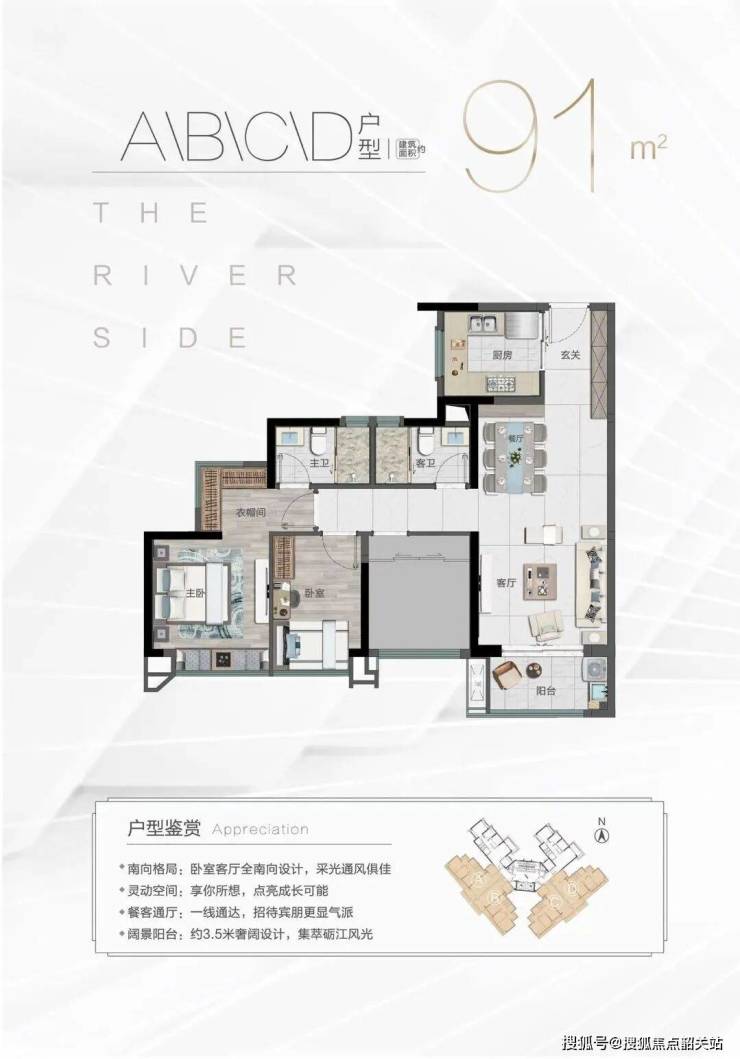 12米超宽采光面:91㎡户型客厅与阳台连通,面宽达3.8米,可容纳6人沙发+85寸电视;