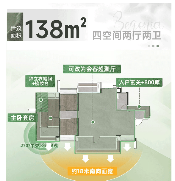 在售户型以改善型四房为主,空间设计贴合实用需求:108㎡四房东南单边位,南北对流,入户花园保障私密;118㎡四房(A/B 户型)南向面宽 15-16.3 米,双阳台 + 独立家政区,主卧带 270° 环幕飘窗,部分户型俯瞰中央公园;138㎡四房南向面宽 18 米,双阳台双面景观(前观公园 / 后望城景),配备 800 库 + 独立衣帽间,适配三代同堂;200㎡顶复为稀缺产品,满足高端改善需求。所有户型均为全南向或南北对流,高拓展飘窗 + 阳台,得房率 130%,精装交付含厨电五件套(三眼灶 / 升降油烟机 / 蒸烤箱等),省心省力。