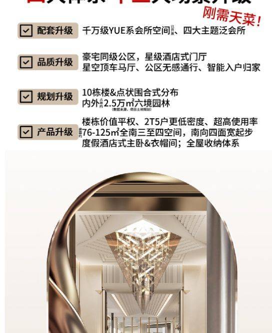 高端会所体验:自带 YUE 系会所空间,以艺术雅奢的设计打造高颜值地标,通过四重礼序归家,还原业主千万级豪宅归家体验。从约 60 米星级酒店式大尺度礼宾归家,到宝格丽酒店同级会所空间(含书咖、手作烘焙区、私密放映厅、台球空间、会客厅、健身房、瑜伽厅),再到水上星河花园归家(流水别墅风格:雕塑视觉水瀑 + 线条感叠水卡座 + 错落造型绿植)以及鎏光度假泳池(带私密更衣室),为业主提供高品质的休闲娱乐空间。