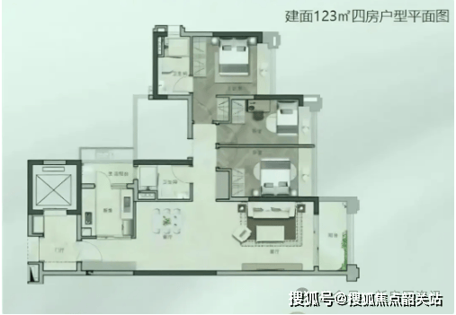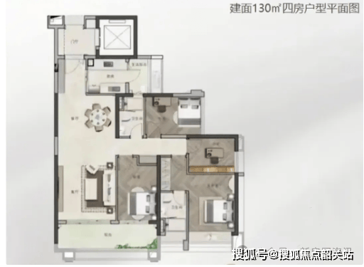 建面约125㎡四房:双主卧设计,南北通透,得房率88%,三代同堂首选;