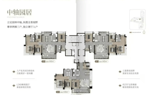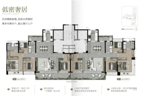 144㎡板楼采用2梯2户设计,私梯入户+独立门庭,相当于“类别墅”体验,在花都极其稀缺;