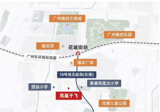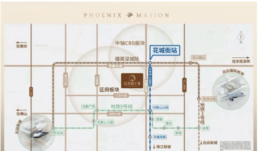 凤凰于飞的位置,可以说是花都目前最具战略眼光的落子之一——它正好卡在花都区府板块和中轴CBD板块的交界处。