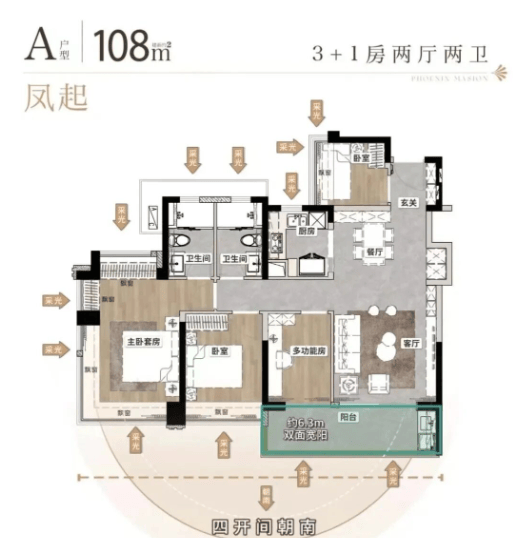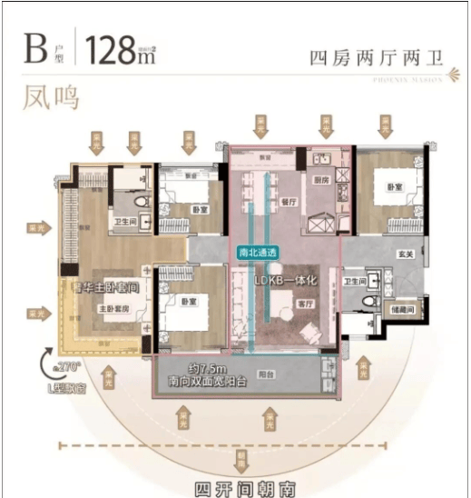 项目主力户型为108㎡、128㎡、144㎡,全部做到南向四开间,采光通风极佳: