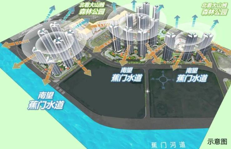 4. **园林景观**:项目周边自然景观资源得天独厚,北面背靠约946万㎡的大山乸森林公园,犹如一座天然氧吧,为居民提供清新的空气和满眼的翠绿,让居民仿佛置身于大自然的怀抱。南面规划约2.5km的滨江景观带,南向约700米宽的蕉门河道,形成了独特的烫金江岸线。居民可以在这里随时随地切换散步、露营、观景等休闲模式,享受惬意的滨水生活。社区内部配建有主题园林,园林内种植各类绿植花卉,搭配景观小品与休闲设施,如蜿蜒的步道、精致的亭台等,为居民提供散步、休闲的好去处。外部自然景观与内部园林相互呼应,营造出宁静、舒适且充满活力的居住环境,提升了居民的生活品质与幸福感。