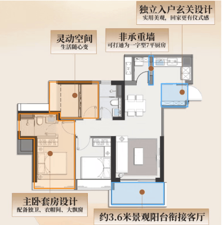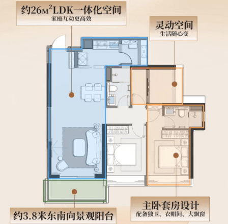 87平方米小户型:虽然空间有限,但设计紧凑实用,采用少承重墙化设计,次卧可以打通或隔开,增加灵活性。主卧配备独立卫浴,提升私密性。