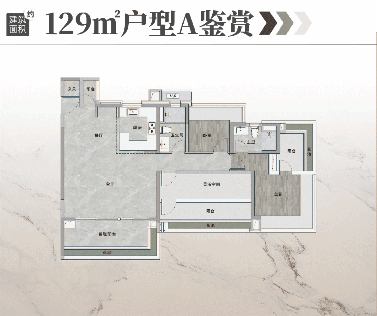 95㎡三房:全屋采光面近 19 米,赠送花池 + 阳台约 10㎡,实际使用面积达 105㎡,做到动静分离,主卧套间配备独立卫浴,居住舒适度媲美 110㎡户型。