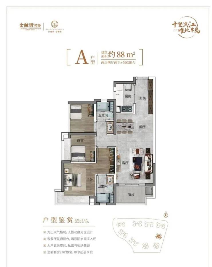 金融街·顺德金悦府位于广州市南部、三龙湾的核心区域——顺德陈村。项目占地面积约7.6万平方米,建筑面积约25.6万平方米,绿化率高达35%。这里提供了89至138平方米的南向瞰江三至四房户型,所有单元均设计为方正格局,南北通透,户户朝南,确保了最佳的采光与通风效果。
